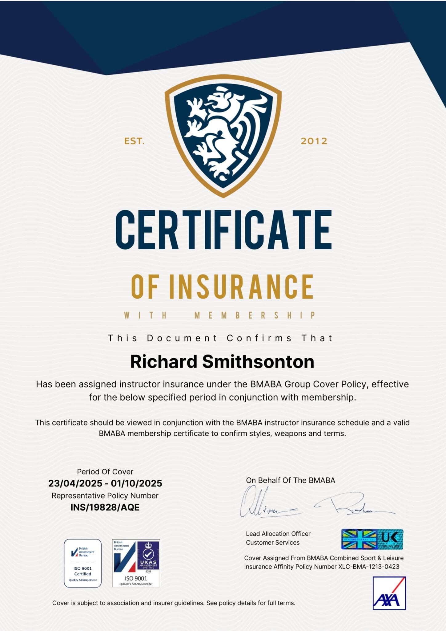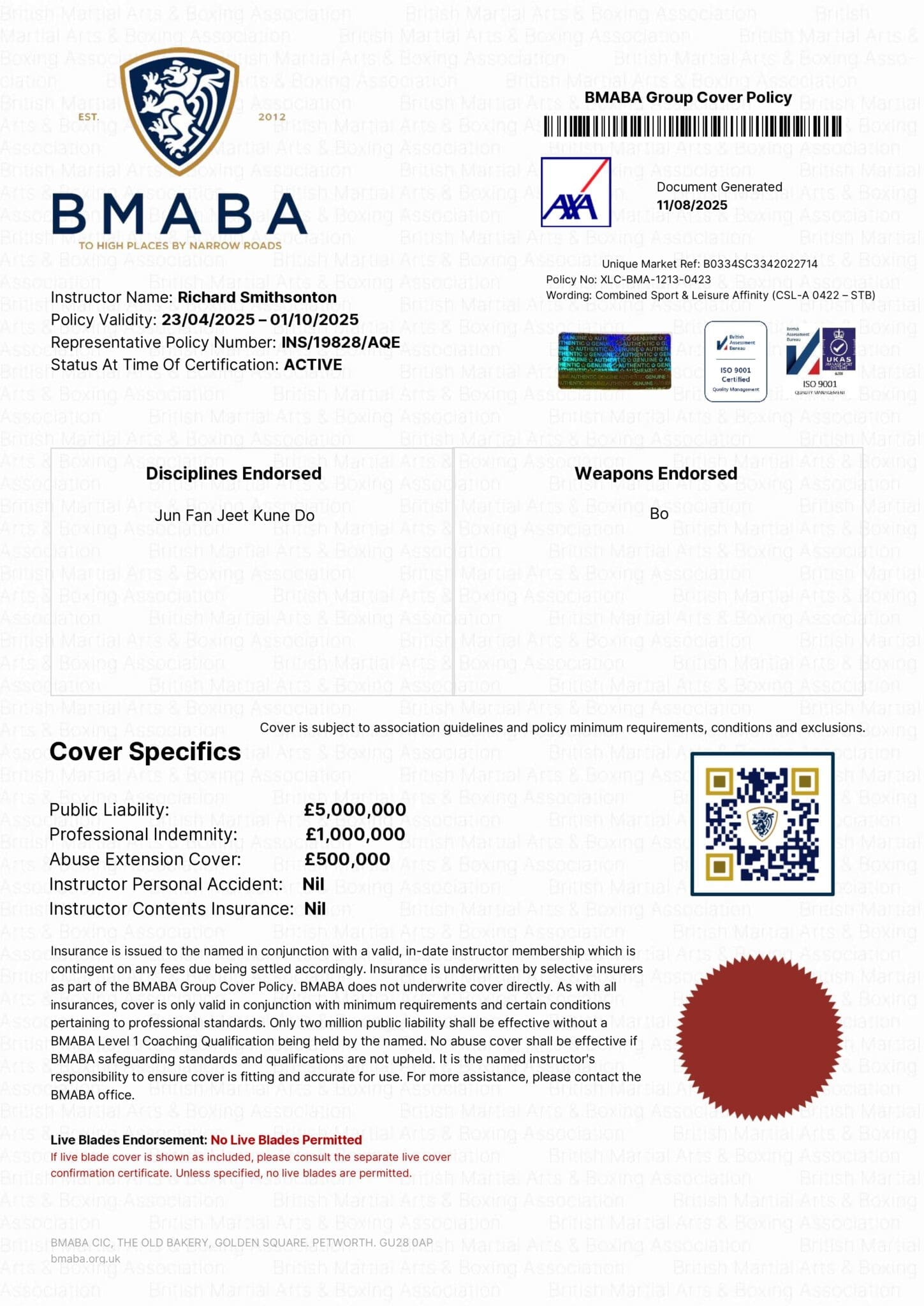 Importantly, member-to-member cover has been explicitly confirmed in writing by AXA XL. Student-on-student incidents during training are covered, something not guaranteed by all providers.