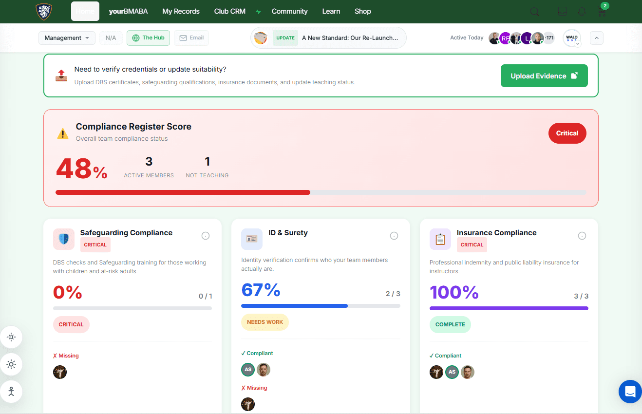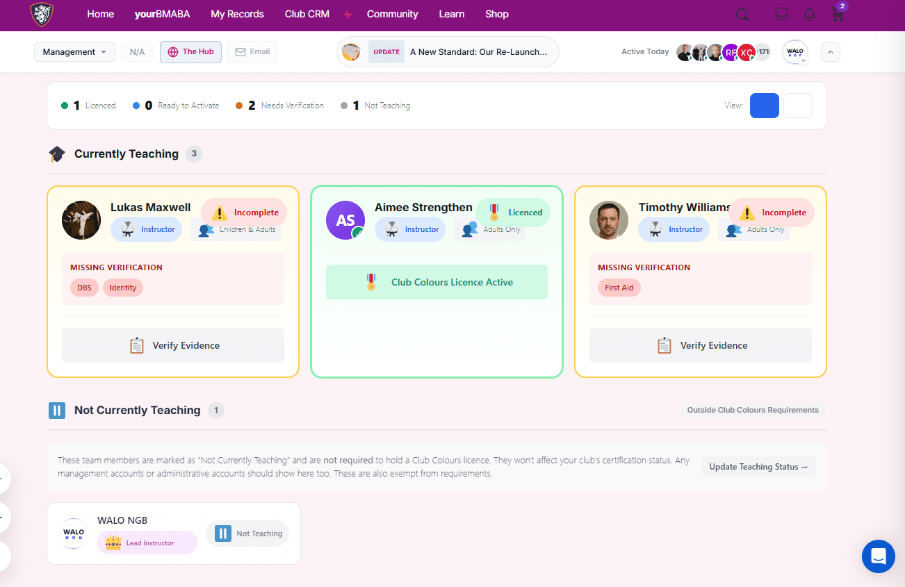 Our Club Colours system goes beyond simple checks. It provides nuanced suitability vetting, clearly showing whether each instructor, assistant, or volunteer is eligible to work with children, at-risk adults, or adults only. The dynamic dashboard makes it easy to see who’s cleared, who needs action, and where your safeguarding responsibilities lie — all in real time.